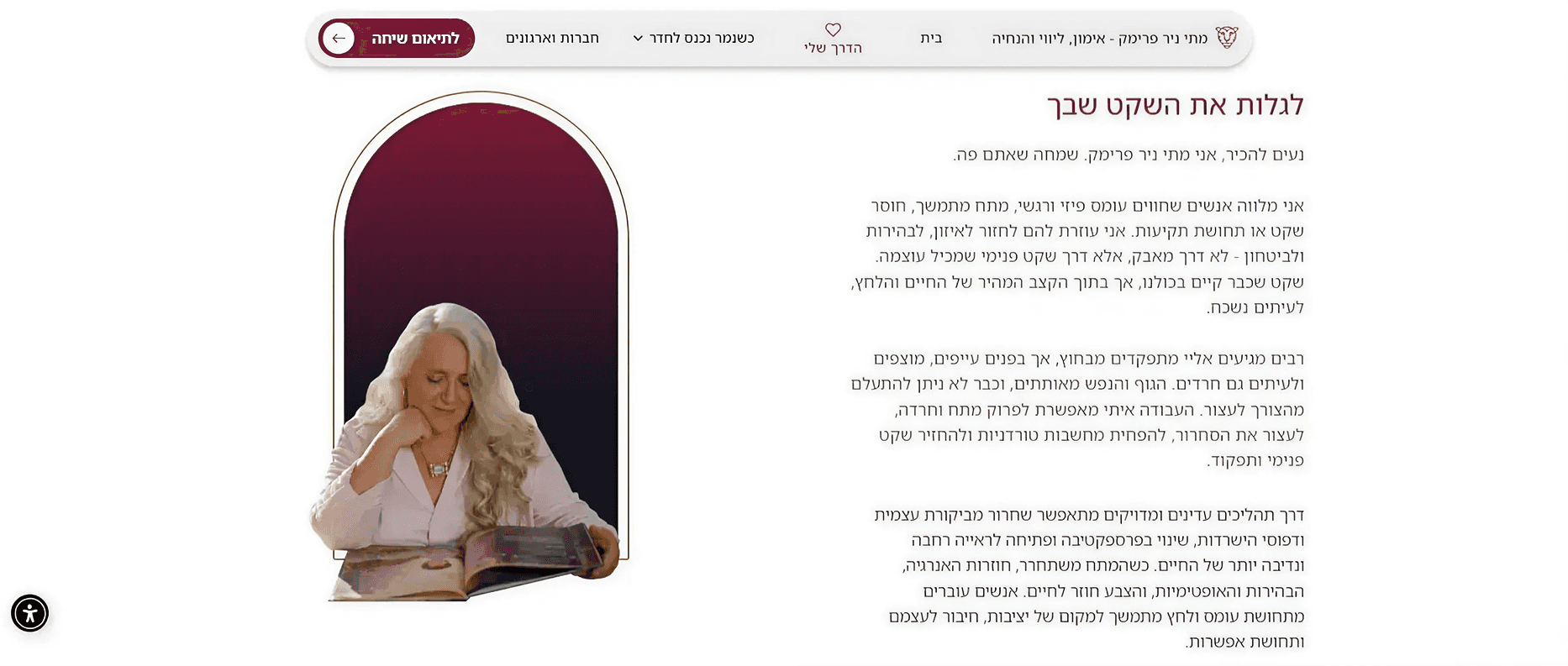 האתר מציג את הרקע המקצועי והגישה הטיפולית של מתי, תהליכי ליווי אישיים